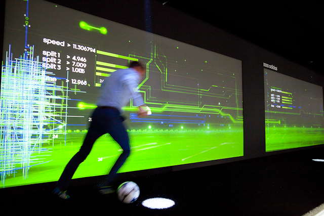This was an interactive 20m track that users ran up and down three times, to identify which Adidas boot was most appropriate for them.  Each of the three stages related to a different skill; speed, agility and control. We also integrated a real time video capture and render system into the track that used the RFID tag in data to upload the user’s video to the Adidas YouTube channel and post an update on their preferred social media channel of this video and their result (overall score and boot preference).