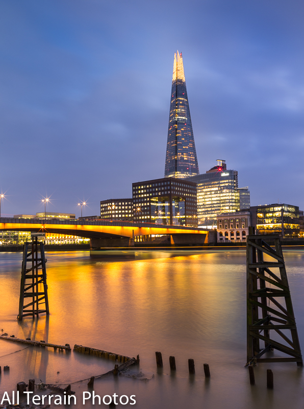 Towards the end of a very grey day in London, the clouds started to break up as I was overlooking the Shard on the River Thames. Lights from London Bridge cast a golden hue in the foreground with the trace of a tourist boat passing.  The tide was dropping fast, exposing the remains of wooden groynes beneath the waters, creating interesting shapes in the river.