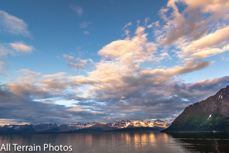 Taken on a summer’s evening in the northern fjords of Norway as the sun was dropping in the skies. Being north of the Arctic Circle, it did not drop much lower than in this image, holding the lovely golden tones for a prolonged period. Although this was mid summer (early July), the snow had only just melted 2-3 weeks prior.